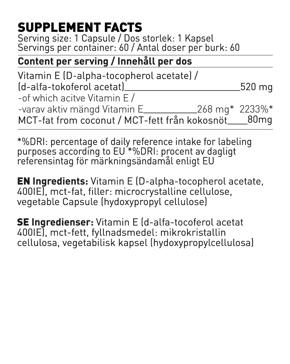 Η βιταμίνη Ε από τα σουηδικά συμπληρώματα είναι ένα συμπλήρωμα υψηλής δόσης που παρέχει 268mg καθαρής βιταμίνης Ε. Η βιταμίνη Ε είναι μια λιποδιαλυτή βιταμίνη, δηλαδή αποθηκεύεται στον λιπώδη ιστό και δεν την ξεπλένουμε ως υδατοδιαλυτές βιταμίνες με τα καθημερινά μας ούρα. Η βιταμίνη Ε αποτελείται από διάφορες λεγόμενες τοκοφερόλες και είναι ένα από τα πιο σημαντικά αντιοξειδωτικά μας που βοηθά στην προστασία του οργανισμού από το οξειδωτικό στρες. Η λιποκάλυψη των κυττάρων (μεμβρανών) προστατεύεται από τις ελεύθερες ρίζες όπως τα μόρια οξυγόνου που διαφορετικά θα μπορούσαν να τους επιτεθούν και να τα διασπάσουν. Καλές πηγές βιταμίνης Ε είναι οι ξηροί καρποί, το αβοκάντο και οι σπόροι καθώς και τα φυτικά έλαια. Συχνά, η βιταμίνη Ε χρησιμοποιείται ως συντηρητικό στα λιπαρά οξέα .